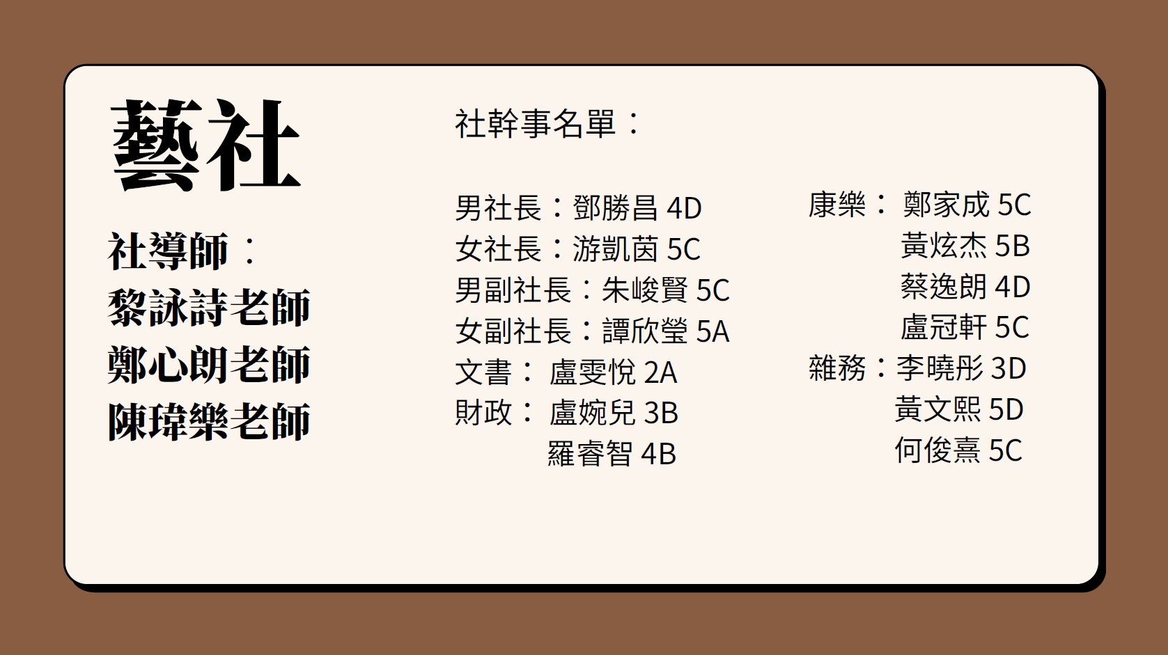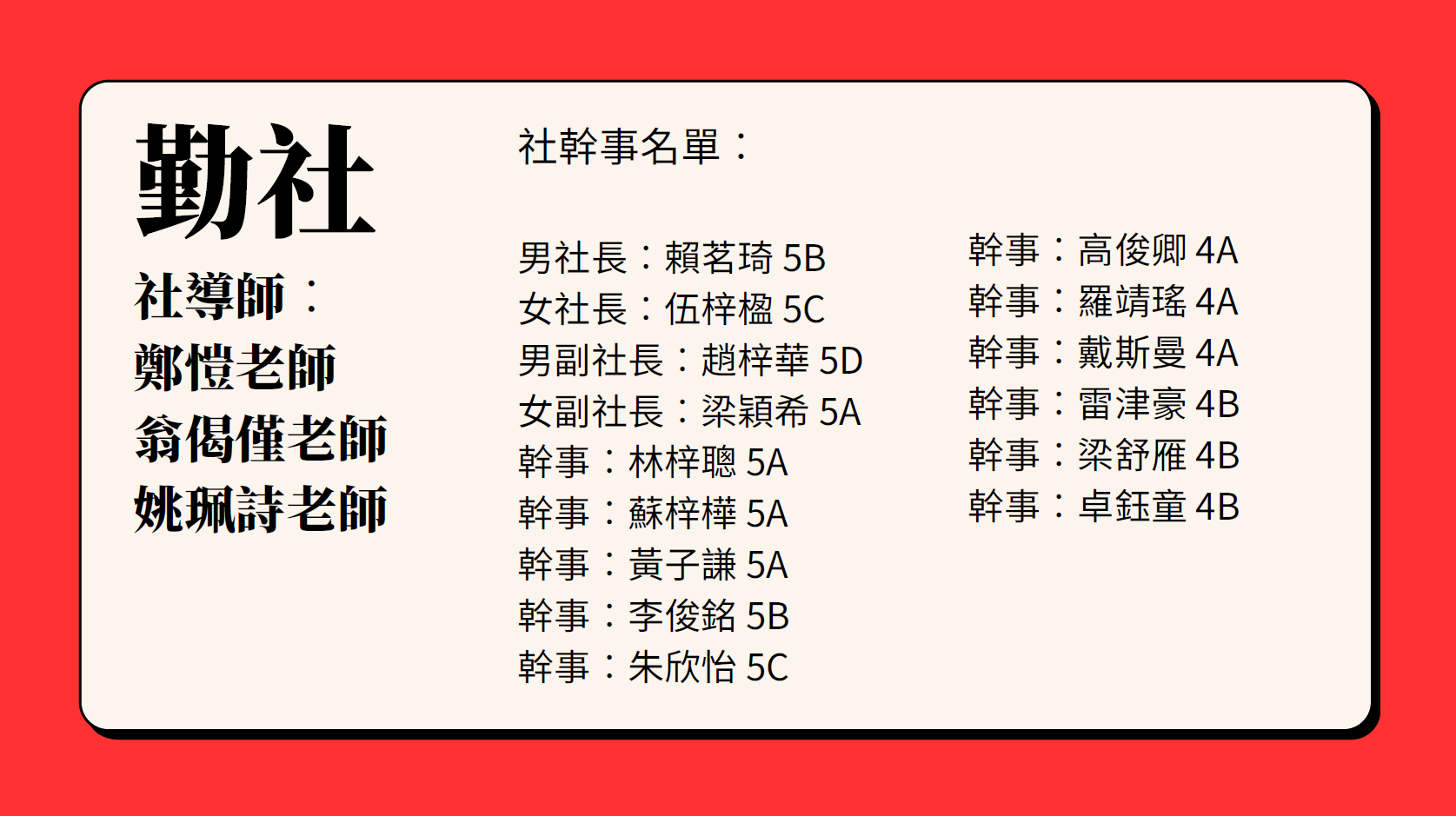 ![]() | 勤社以「勤奮力學」為核心精神,勉勵社員以勤補拙、以恆致遠。我們相信「天道酬勤」,每一份的努力都是邁向卓越的基石。在「勤」社,我們注重培養堅持不懈的品格,讓「勤」成為一種習慣、一種力量,讓社員互勉互助,共同成長。期待每位社員在此耕耘不輟,在求學生涯寫下「勤」的印記。 |
