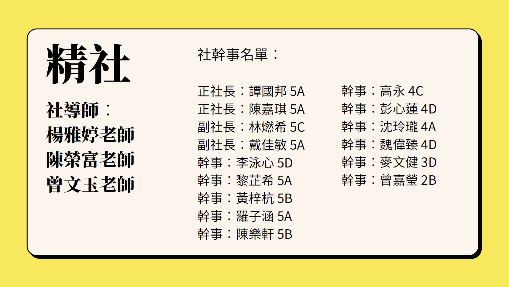 ![]() | 希望各位精社社員踴躍參加本年度各項社際比賽,為社出一分精力。我和社幹事會全力為大家打氣!凝聚精社同學既力量,打造廠商最強! 精社口號:精益求精!精社必勝! |