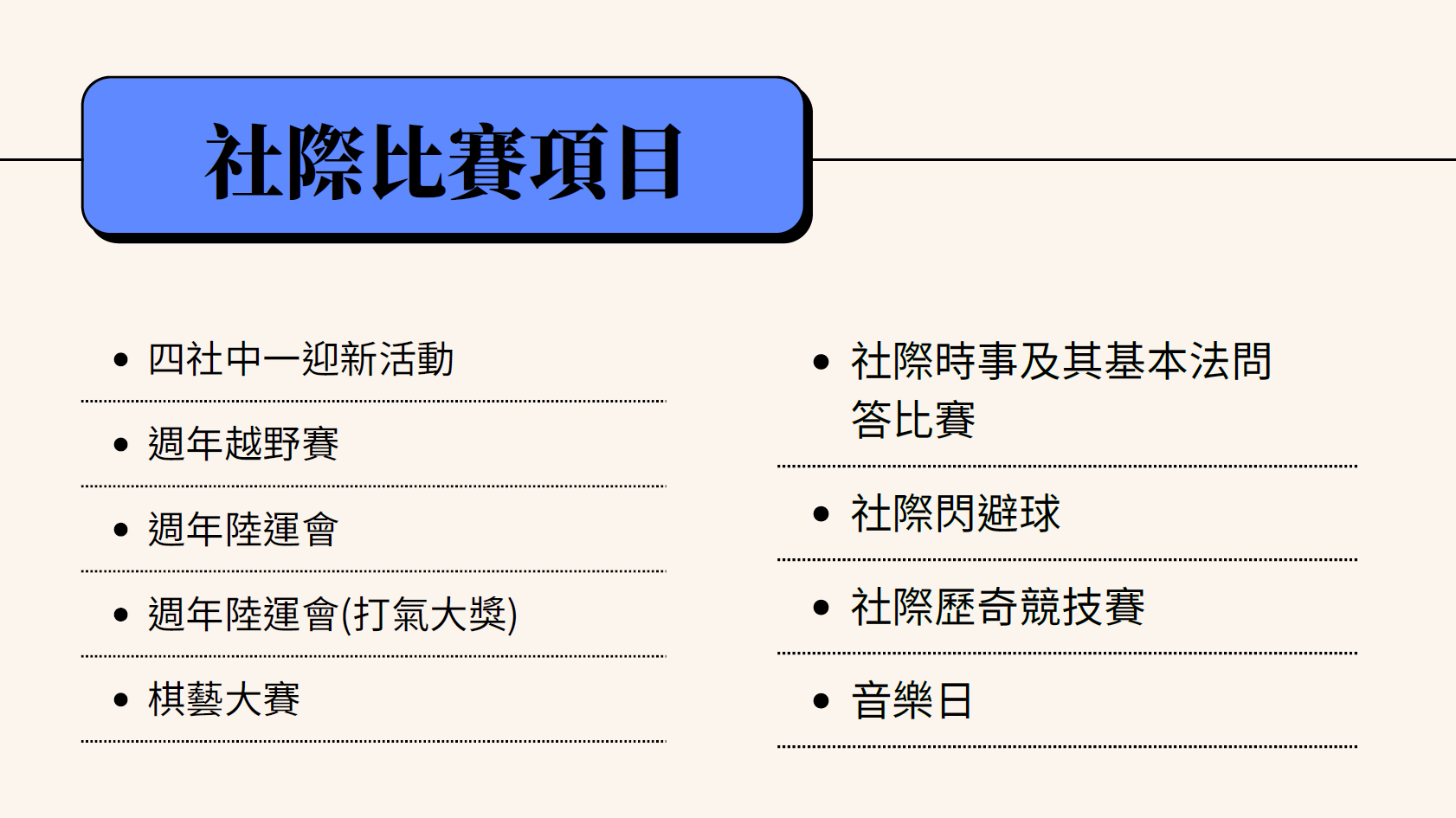 ![]() | 我哋社有三大目標: 1. 積極參與 – 鼓勵社員積極參與社際比賽,享受比賽中的樂趣,增進同學之間友誼。 2. 不計輸贏 – 全力以赴、不計輸贏。 3. 挑戰自己 – 各同學做到不計輸贏地積極參與就是挑戰自己。 |