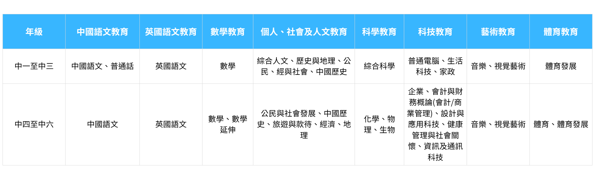 科目 | 中 一 | 中 二 | 中 三 | 中 四 | 中 五 | 中 六 |