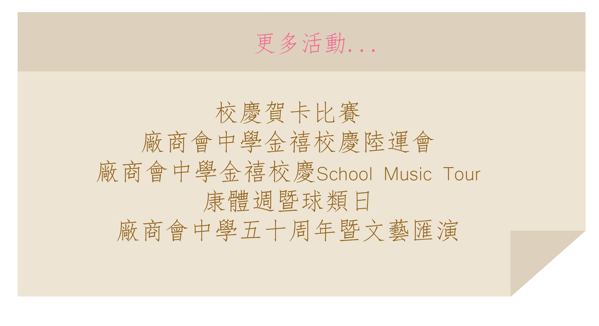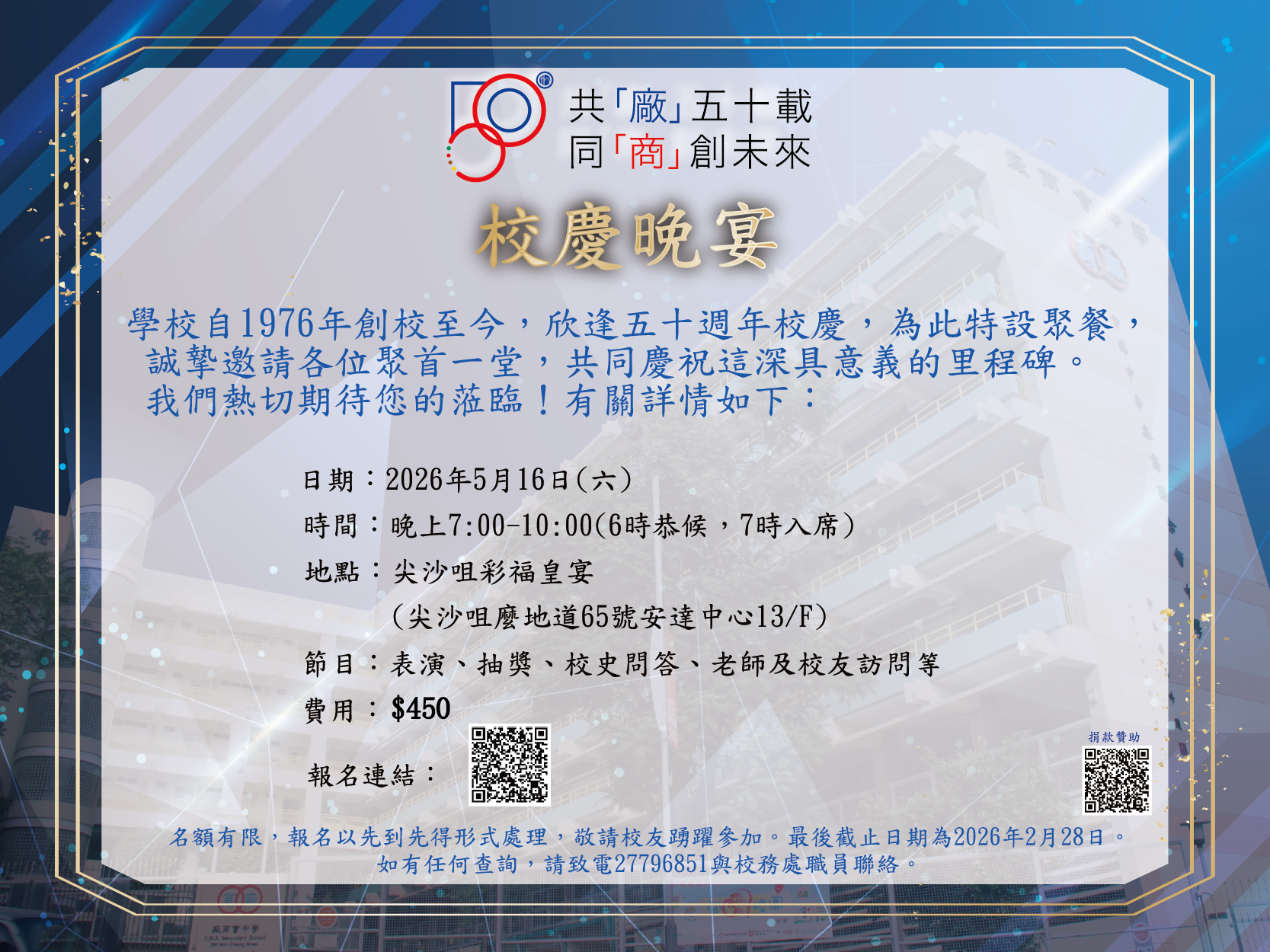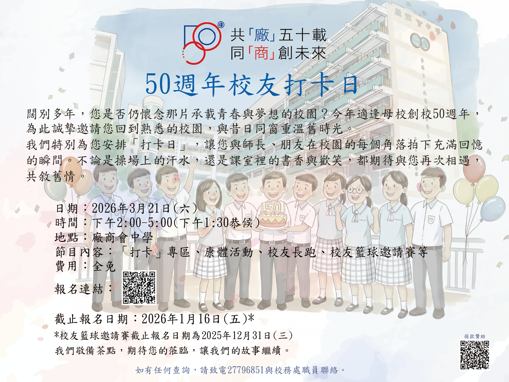 50 週年校慶 50週年校慶標誌得奬作品 【 共同成就未來】 為支持母校50週年活動及添置教學設備,您的慷慨捐助至關重要。如欲為母校獻一分力,歡迎點擊以下連結,查閱有關的資訊。:https://forms.gle/VpVPoefUx5HgLEcGA